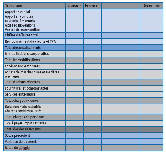 Le plan de trésorerie permet de connaître, mois par mois, l’état et l’évolution prévisionnelle de la trésorerie de la future entreprise. C’est un tableau qui présente tous les encaissements et décaissements de l’entreprise durant l’année en cours :